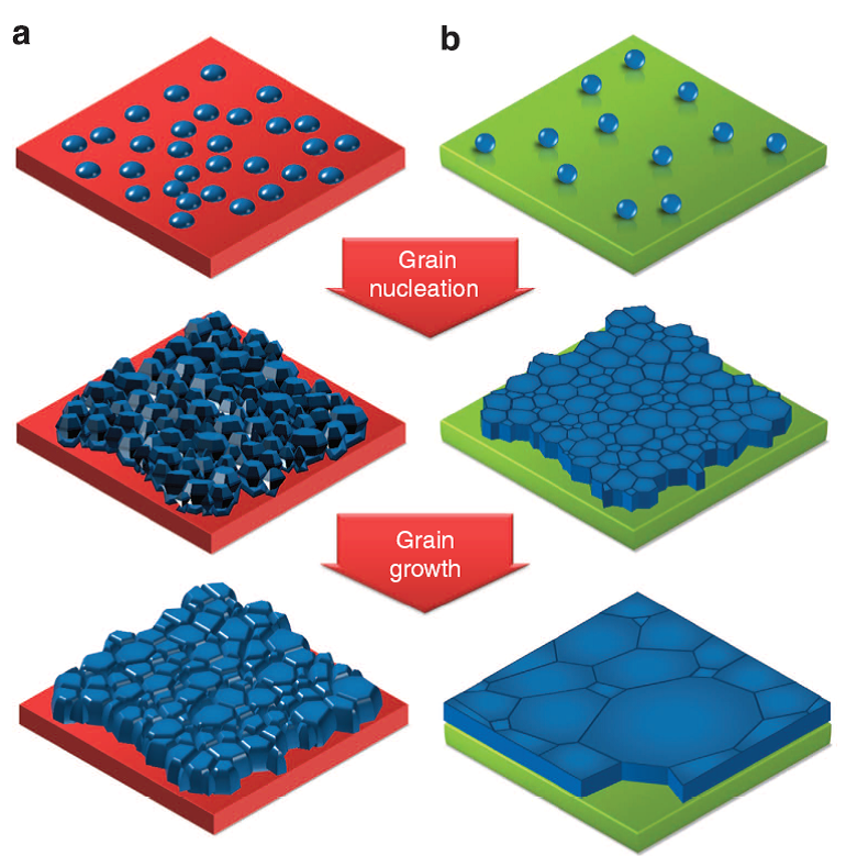 多晶薄膜太阳能电池中需要晶体具有高的深宽比以减少晶界间的电荷复合。不过,有机卤化钙钛矿电池(OTP)中晶区尺寸往往受到膜厚的限制。 Bi 等人报道了在非浸润空穴传输材料表面制备OTP薄膜的方法,得到的晶粒深宽比在 2.3-7.9 的范围内。减少的晶界极大地降低了OTP中电荷复合的概率,甚至达到单晶水平。他们用低温溶液加工的方法制备的平面异质结OTP器件的最高效率达到 18.3% 。这一提升OTP薄膜质量的简单方法有望用于提升其他光电子器件领域以提高性能。(Nature Communications DOI: 10.1038 / ncomms 8747 )