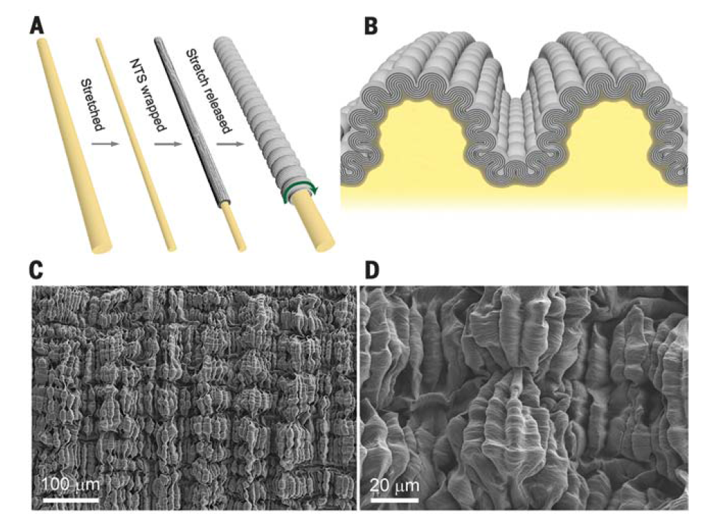 (Hierarchically buckled sheath-core fibers for superelastic electronics, sensors, and muscles)
