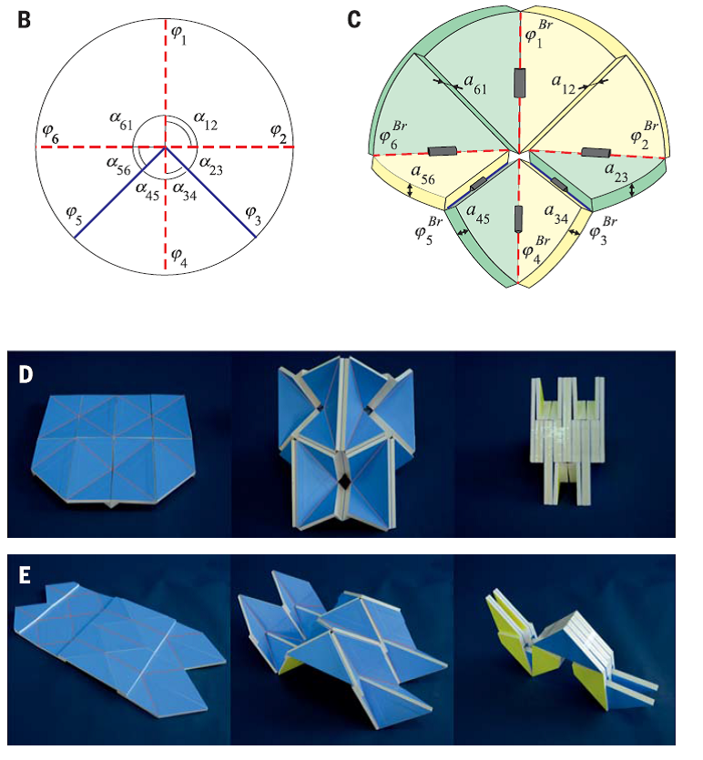 很多折叠方法可以应用于“零厚度”材料的折叠上,如纸张。不过对厚度较厚的材料来说,折叠它需要添加材料和补偿。 Chen 等发明了一种通用的模型,他们用刚性结构代替标准的圆柱形结构,这使得“零厚度”材料和厚材料的折叠是一样的。此外,转折处被限制只能沿着一个方向运动,这对于自动解折叠是很有用处的,例如太空中伸展太阳能面板或是伸展大型工程器械。(Science 10.1126 / science.aab 2870)