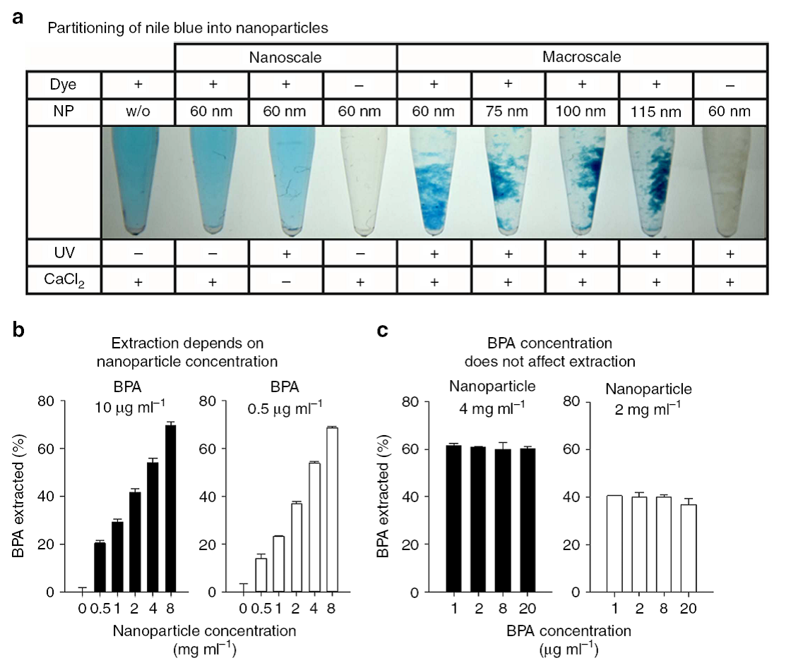纳米技术在环境净化方面可能具有更快、更高效的优势。 Brandl 等人制备了两亲性二嵌段共聚物光敏核壳型纳米颗粒。当用紫外线照射后,维持胶体稳定的保护层脱掉,剩余的纳米颗粒迅速形成宏观的聚集体,它可以快速吸附水中和土壤中的憎水性污染物质。初步的活体实验表明,光裂解纳米粒子处理可以显著降低双酚A,三氯沙等物质的致畸性,而且不会产生有毒副产物。(Nature Communications DOI : 10.1038 / ncomms 8765 )
