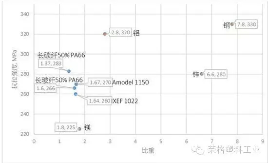 1:几种代金属塑料与金属抗拉强度及比重的比较。