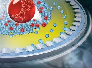 (图示为液滴在芯片实验室系统上的三维图:当盘旋转时,水滴从作为通道口被撕下。一层油确保水滴不会再结合。图片来源:Hahn-Schickard。)