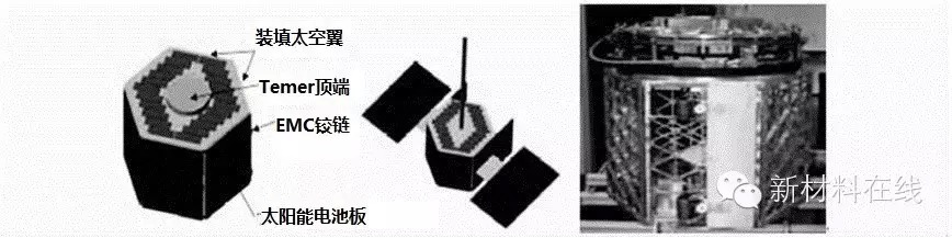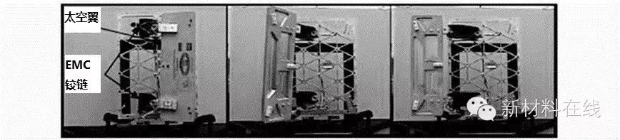 形状记忆合金主要应用于机械工程、医疗器械、航空航天工业、工程建筑以及日常生活中。在机械工程中领域,形状记忆合金常用来作力敏、热敏驱动元件和阻尼元 件,如军用机械形状记忆合金紧固件、温度调节器、金属封隔器、航天器分离机构上的驱动器、紧固铆钉等。形状记忆合金在驱动领域的应用最显著的特点是几乎没 有驱动能量的消耗。在医疗器械领域,形状记忆合金广泛应用在制造骨骼、心脏修补器、伤骨固定加压器、栓塞器、各类腔内支架、血栓过滤器、牙科正畸器、手术 缝合线和介入导丝等,而其中的Ni-Ti形状记忆合金更是成为记忆合金产业的首选材料。在在航空航天工业领域,形状记忆合金的应用包括飞机的液压系统中的 低温配合连接件、直升机的智能水平旋翼、卫星太阳能电池板和卫星太空翼等。美国科罗拉多大学、美国CTD 公司和美国喷气推进实验室利用形状记忆聚合物的回复特性,制作DINO Sat 卫星上面的可展开太阳能电池板,他们在卫星上使用形状记忆复合材料制作成铰链,通过温度的变化来驱动2块铝制偏航板,如图3、图4和图5所示。