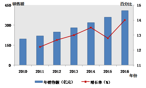 图13 2010-2016年智能材料年销售额及增长率情况估计(数据来源:BCC Research)