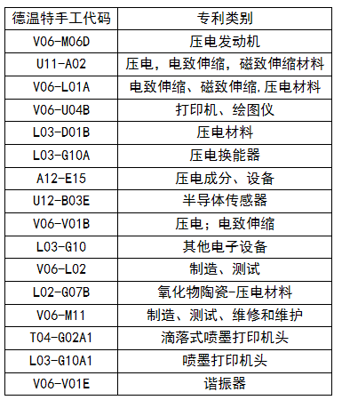 从国外的专利分类申请量来看,在V06-M06D(压电发动机)、U11-A02(压电,电致伸缩,磁致伸缩材料)领域的申请量较高,智能材料的研究应用领域主要集中在这些分类上。可以看出智能材料的研究还是主要集中在压电材料以及压电的相关领域,该领域的发展较为成熟稳定,如图12所示。
