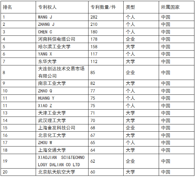 为了进一步研究中国专利数量如此之多的原因,笔者统计了优先权国家为中国的排名前20的专利权人,结果如表1所示。排名前20的专利权人全部来自中国国内,其中12个为中国本土企业和科研院所,8个为个人。其专利数量占据了中国专利总量的15%以上。由此可见,在中国申请的碳纤维专利绝大多数来自本土研发力量。随着中国社会对碳纤维重视程度不断提升,各相关机构投入了大量的人力物力,研发热情高涨,专利申请呈现快速发展态势。同时也可以看到,由于与国外领先企业存在巨大技术差距,国外领先企业在中国进行专利布局的热情并不高。