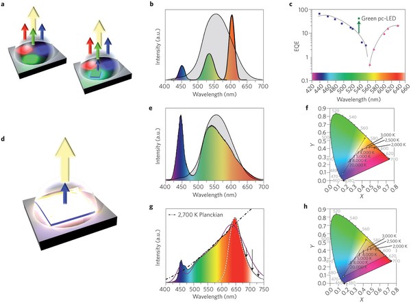 a.白光LEDs示意图。左:三个直接发光LEDs(蓝光,InGaN;绿光,InGaN;红光,AlInGaP)。右:两个直接发光LEDs(蓝光,InGaN;红光,AlInGaP)和一个绿光pc-LEDs。