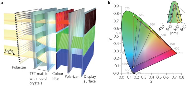 a. LCD显示器示意图。TFT表示薄膜晶体管(thin-film transistor)。