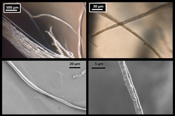如图所示为麻省理工学院的研究人员模拟蜘蛛丝制备的纤维材料。上图光学显微镜图像,下图为扫描电子显微镜图像。左图是8微米的纤维,右图是3微米的纤维。