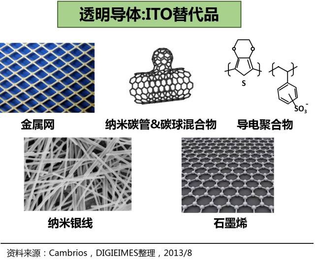 目前ITO导电玻璃的替代技术主要有石墨烯、导电聚合物、纳米碳管、金属网格、纳米银线等技术。据调研机构NanoMarkets预估,自2014年起,ITO替代品的市场规模将有爆发性的成长,未来将有超过80亿美元。
