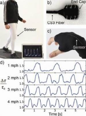 为了解决这些限制,Jennifer Lewis,Conor Walsh以及他们在哈佛大学的同事创造了一种电容,纤维基的柔性传感器,可以探测伸长应力。电容传感器,原来被大量使用在压力和切应力的传感中,基本上电容传感器是由介电层和导电层组成一个三明治结构,该结构的厚度在应力下会发生改变。使用一个由Lewis于2011年发明的核壳3D打印技术,该技术本来是用于制造光纤。他们小组制作核壳纤维,这种纤维有四个核心,由离子导电液体(非易失性混合的甘油,氯化钠和聚乙二醇构成),一个硅树脂弹性体材料提供了与衣物良好的兼容性,同时电容传感器这个方法消灭了之前的电阻传感器的弊端。