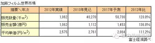 与此同时,根据富士经济公布的数据表明,装饰薄膜应用于智能手机、平板设备、汽车零部件、消费类电子产品的规模进一步扩张。装饰薄膜的全球市场规模如下表: