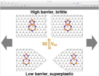经计算,研究人员发现直接键合的能垒要低于旋转键合,“通过直接键合的方式,缺陷的移动速度以数量级式增长,”Yakobson说道。“我们知道材料的力学性能如脆性或韧性都是由这些缺陷的流动性所决定的。研究结果表明我们可以影响材料的性能,比如拉伸性。”