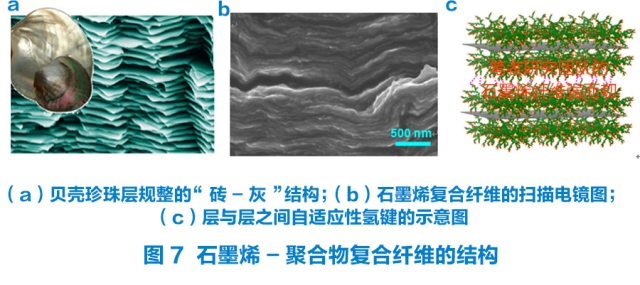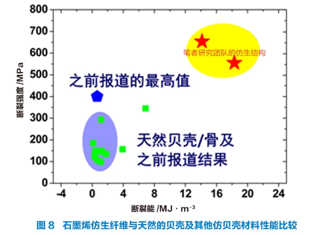 氧化石墨烯具有丰富的官能团,为其功能化和制备石墨烯复合物提供了基础。在石墨烯复合纤维方面,Gao等利用线性的聚乙烯醇和超支化的聚缩水甘油醚分别与石墨烯进行复合,然后利用聚合物功能化的石墨烯进行湿法纺丝,得到数十米、上千米的石墨烯复合纤维。该种纤维具有与贝壳珍珠层相似的“砖-灰”结构(图7),层与层之间由自适应性的氢键网络连接,使其同时拥有高强度、良好的柔韧性和导电性等优点。值得一提的是,石墨烯与超支化聚缩水甘油醚的复合纤维通过戊二醛交联之后,拉伸强度达到650MPa,比纯的石墨烯纤维还要高出150MPa, 充分体现了其仿生结构的优越性。与天然的贝壳材料及其它仿贝壳材料相比(图8),笔者研究团队的仿生纤维不但具有更高的断裂强度、更高的断裂能,而且能够连续化,为其工业化生产提供了条件。