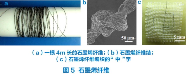 Gao等在2011年发现了氧化石墨烯在水溶液中会自发排列形成液晶,随浓度变化可由向列相转变为层状相。这一发现不但丰富了液晶家族,为二维粒子形成液晶提供了先例,而且为长程有序石墨烯组装材料的发展奠定了坚实的基础。同年Gao等利用工业可用的湿纺技术,首次成功将氧化石墨烯水溶液纺成数米结构规整的纤维(图5),该纤维不但具有较高的强度(102MPa),而且具有良好的柔韧性,可打成很紧密的结,所得纤维的打结照片入选为Nature年度图片。用氢碘酸还原之后,石墨烯纤维强度提高至140MPa,还原后的石墨烯纤维具有良好的导电性(2.5×10^4S/m),使其在导电织物等方面具有广阔的应用前景。2012年,通过增大氧化石墨烯尺寸和改进纺丝工艺,笔者团队得到了高强度的石墨烯导电纤维(500 MPa),与文献报道的数据相比,这种纤维具有更高的拉伸强度和更好的韧性(图6)。