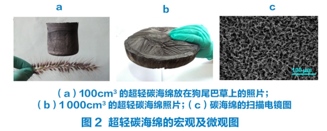 Gao等将二维的石墨烯片和一维的碳纳米管结合起来,先将氧化石墨烯水溶液与碳纳米管混合,再用冷冻干燥的办法得到碳气凝胶,化学法还原后得到超轻、导电并且富有弹性的碳海绵。这种碳海绵具有比空气还低的密度(0.16mg/cm^3),是世界上最轻的固体材料,并具有规整的三维网络结构,如图2所示。由于石墨烯和碳管的协同作用,这种具有三维稳定网络结构的碳海绵无论是在低温的液氮中(-196℃)还是在300℃的高温下都具有良好的弹性(图3)。另外,由于石墨烯亲油疏水的特性,这种碳海绵可以超快吸油(图4),并且可以循环吸收300倍质量的原油,或者750倍质量的四氯化碳,这种特性为其提供了广阔的应用空间。碳海绵还可能成为理想的相变储能保温材料、催化剂载体以及高效复合材料。