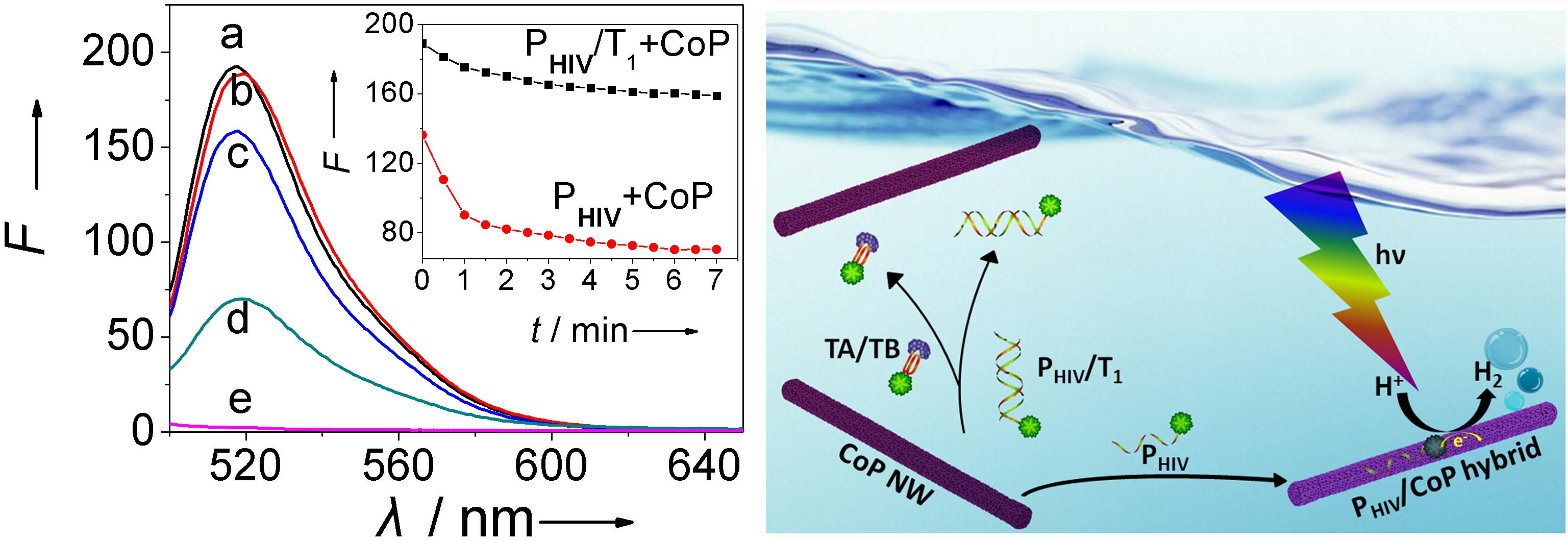 同时,该课题组还创新性地利用过渡金属磷化物的H+还原催化特性加速光导电子转移,发展了CoP纳米线新型荧光淬灭剂,实现快速、高效DNA荧光检测(图2)。本研究结果发表在Angew. Chem. Int. Ed. DOI: 10.1002/anie.201501237。该工作在前期系列研究的基础上,拓展了过渡金属磷化物的分析应用,突破了富共轭π电子纳米传感界面不能有效利用转移电子提高传感性能这一难题(Nucleic Acids Res. 2011, 39, e37;Small 2011, 7, 1562; Biosens. Bioelectron. 2011, 27, 167; Chem. Commun. 2011, 47, 961; Chem. Commun. 2011, 47, 2625; Nanoscale 2011, 3, 967),为基于光导电子转移的荧光淬灭机制提供了直接证据,拓宽了视野,并为荧光传感与能量转换多功能系统集成研究提供了新思路。