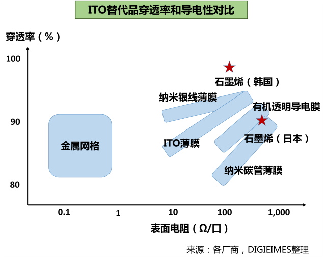 理论上,石墨烯的透光度及电阻性能都占优势,但是由于其制程工艺复杂,在设备改进、工艺优化等方面都预示在前期需要有巨大的投入,售价也很高。在很长一段时 间内,石墨烯都不具备量产的条件。纳米碳管工业化量产技术尚未完善,其制成的薄膜产品导电性还不能达到普通ITO薄膜的水平。从技术与市场化来说,金属网 格与纳米银线技术将是有望替代ITO导电玻璃,成为柔性屏幕的主角。