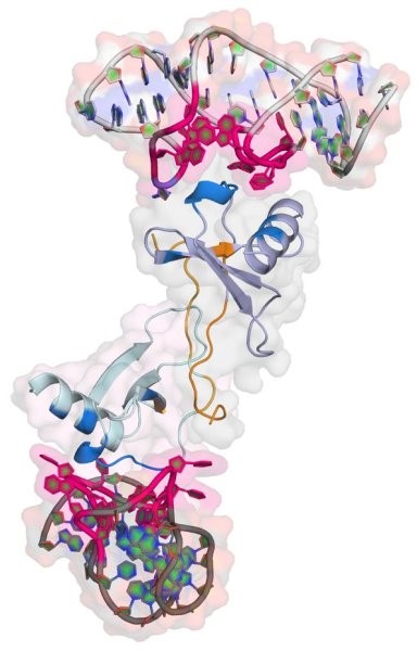 这是镜像核苷酸NOX-E36与其靶蛋白CCL2结合体的结构。(来源:Dominik Oberthür/德国汉堡自由电子激光中心)