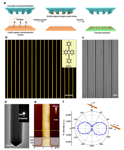 有机单晶一维材料能有效传输电荷和激子,因为它们具有高度有序的分子排列结构和极小的缺陷。控制有机单晶一维材料的排列和位置可以使光子/电子按需求的方式传输,这也是波导和其他光电子器件应用的先决条件。Wu等报道了一种物理沉积传输技术,这种技术可以控制有机单晶线的生长、排列和定位。用这个方法他们制备了亚微米宽、几百微米长、高度取向排列的有机单晶线。作者认为他们的方法开启了控制有机单晶一维材料生长的新方法,在有机光电子器件方面具有巨大应用潜力。(Nature Communications DOI: 10.1038/ncomms7737)