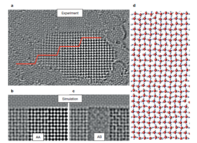 水以多种形式存在,如液体、气体以及各种晶态或无定型态的冰,其中六角形的冰晶形成各种迷人的雪花。同样普遍但很少被注意到的一种状态是被吸附或限制在微孔结构中的水。这种低维度的水决定了材料学、地质学、生物学、摩擦学以及纳米技术等领域的各种现象。理论证明了很多低维度水可能存在的状态,但通过实验来证明其晶体结构很困难。Grigorieva 等人报道了借助高分辨率电子显微镜成像技术观察到锁在两层石墨烯之间的水的晶体状态。他们发现这种纳米尺度束缚的水在室温下呈现出正方形的晶体结构,而非常见的六边形结构。(Nature doi: 10. 1038/ nature 14295)