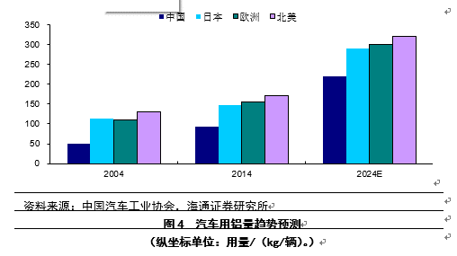 近年来奥迪、捷豹路虎、福特等都使用了全铝式的车身结构,铝合金已经成为了一种比较理想的轻量化材料,铝合金还可以按照添加合金的不同和比例的不同以及制造工艺的区别,应用在车身、车架、制动盘、发动机气缸体、气缸盖、活塞、进气歧管、摇臂、发动机悬置支架、空压机连杆、传动器壳体、离合器壳体、车轮、制动器零件、把手及罩盖壳体类等地方。目前国内汽车制造业的汽车用铝与发达国家存在着一定差距,但随着汽车制造业的竞争日趋国际化和节能减排的需求,汽车用铝量的增加已是必然趋势,据中铝预测,10年后我国的汽车用铝可由当前的平均每辆车92kg提高到220kg(图4)。