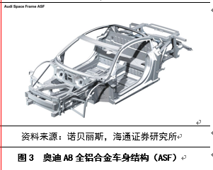其实,铝在汽车中的应用史已经很长。铝进入汽车的应用最早可以追溯到1899年,之后铝一直应用于运动跑车和赛车,而真正将铝带入汽车轻量化量产阶段的厂商是奥迪。1994年奥迪汽车公司开发了全球第一辆全铝车身框架轿车——第一代Audi A8(图3),其使用的全铝空间框架结构(ASF车身结构)在车身的强度和安全水平超过了现代轿车的基础之上,汽车自身的质量却减轻了大约40%;1999年,AudiA2成为首批采用该技术的量产车。如今,奥迪独创的ASF技术,已经运用于A8、TT、R8等众多量产车型上。这一技术的运用,着重提高了上述奥迪车型的动力性能和高效性能。
