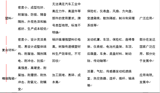 在轻量化技术中,轻量化材料的开发和应用是当前最主要研究方向。在轻量化材料的使用方面,用高强度钢和铝、镁合金替代普通钢来制造汽车主要承载构件已成为一个发展趋势。此外,塑料、复合材料、精细陶瓷也被应用到汽车结构中。其中,使用高强度钢、玻璃纤维复合材料、铝、镁、碳纤维复合材料代替原本的低碳钢可分别减轻质量15%~25%、25%~35%、40%~50%、55%~60%、55%~60%。图2为轻量化材料在汽车中的应用部位图,表3为轻量化材料性能及应用对比。