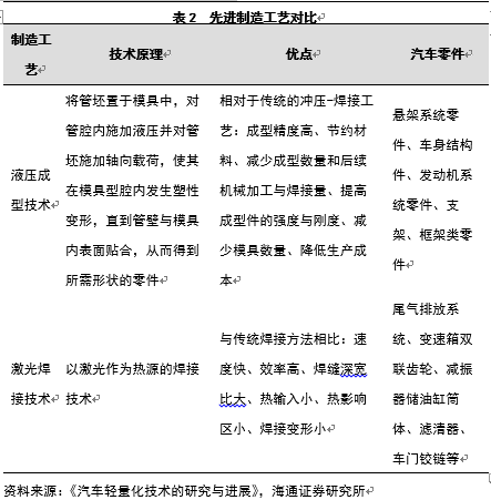 实现汽车轻量化的先进工艺主要包括液压成型技术和激光焊接技术。