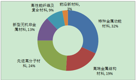 自2010年以来,中国新材料产业规模一直保持稳步增长,由2010年的6500亿元增长至2014年的16000亿元左右(如图1),年均增速保持在25%左右。在细分领域方面,特种金属功能材料占比约为32%,高端金属结构材料占比约为19%,先进高分子材料占比约为24%,新型无机非金属材料占比约为13%,高性能纤维及复合材料占比约为9%,前沿新材料占比约为3%(如图2)。