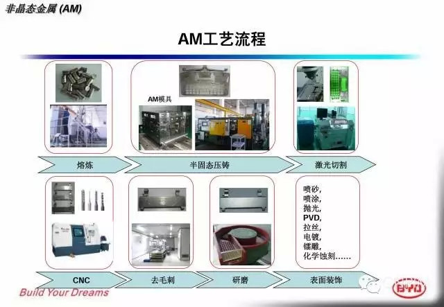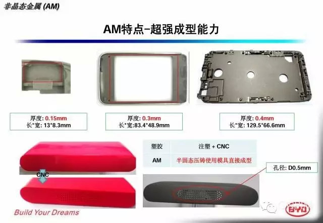 比亚迪公司中央研究院,开发出了锆基非晶材料与成型技术(AM技术,Amorphous Metal),该技术利用非晶材料在过冷液相区超塑性成型的特点,实现精密复杂轻薄零部件产品的近终成型。