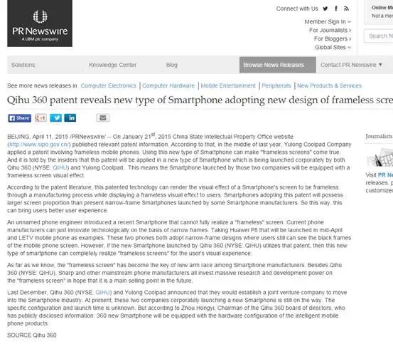 根据专利资料显示,手机无边框专利技术可在不改变当前制造工艺基础上,实现用户再视觉上的无边框体验。据了解,目前智能手机尚未实现真正的无边框,多数只是 在窄边框的基础上进行工艺创新,无边框屏幕也成为手机厂商新一轮竞争焦点。如果360手机采用上述专利,或成为未来无边框手机的领军企业。