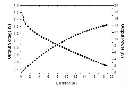 中国科学院宁波材料技术与工程研究所动力锂电池工程实验室在优化阴极空气扩散电极的结构与制备工艺,以及开发高性能的锰氧化物氧还原催化剂的基础上,成功研制出1000Wh镁空气电池样机,详见图1所示。该电池由5个单体电池串联而成,以AZ31镁合金为阳极,以10%的NaCl溶液为电解液,以上述空气扩散电极和锰氧化物催化剂为阴极。该镁空气电池的外观尺寸为200×150×150 mm3,重量为2.3 kg,能量密度可达430 Wh/kg,最大输出功率可达80W,其单体电池的I-V曲线如图2所示。上述镁空气电池具有较好的商业化前景,可应用为野外供电电源、移动电源、备用电源和应急电源等。