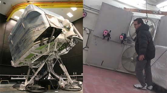 可倾斜的实验设备-复合图:研究组测试该复合材料制成的防滑鞋,让实验志愿者穿上鞋子行走在冰面覆盖的倾斜地板上。该倾斜地板是 “Winterlab/冬季实验室” (左图)的一部分,那是一个独立可倾斜的实验空间,是多伦多康复所挑战环境测试评估实验室的一部分。