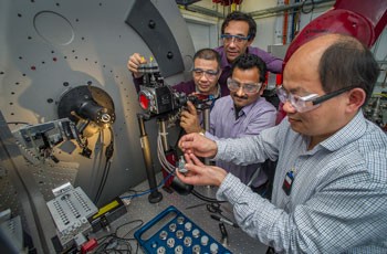 布鲁克黑文实验室的王冯教授郑将阴极材料样品诸如XRD衍射仪的样品托里,地点为NSLS II。组里的其他成员(从左到右)为Jianming Ba, Eric Dooryhee 和Sanjit Ghose。