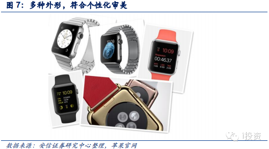 8、Apple Watch其他亮点:尺寸1.5和1.7两个版本,材质白钢,黑钢,白铝,黑铝,玫瑰金,纯金(无陶瓷)。其中市场关注的黄金比率,我们认为并没有30%,目前5%左右。