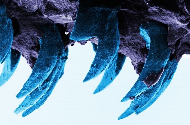 用扫描电子显微镜得到的帽贝牙齿的图像。(来源:普茨茅斯大学)