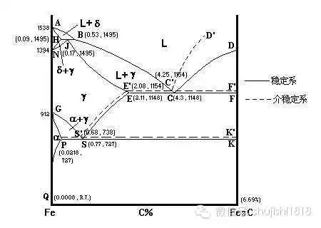 复线铁碳相图,是在实线的Fe-Fe3C相图上再叠加上虚线的Fe-G相图,不同点在于: