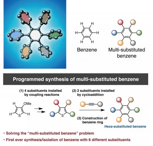 名古屋大学转型生物分子研究所(ITbM)及JST-ERATO项目纳米碳分子课题组的教授Kenichiro Itami, Junichiro Yamaguchi, Yasutomo Segawa 及Shin Suzuki发明5或6个取代基苯衍生物的第一个程序合成方法,并分离、表征了合成产物。苯是制药领域中最常见的结构,多取代苯衍生物也是有机电子器件中最常用到的。尽管拥有众多用途,但因为缺乏一种能在目标位置选择性取代特定官能团的合成方法,多取代苯衍生物的合成一直以来都比较困难,在这种现状驱动下,Itami课题组研发出一种特殊的顺序合成方法来制备5-取代或6-取代的苯衍生物。