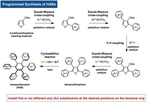 “合成HABs的关键步骤是用噻吩(一种含有硫原子的5元环)作为起始原料”,项目共同领导人Junichiro Yamaguchi说。“2009年我们曾通过C-H活化的方式程序合成了含有4个不同芳基的噻吩,现在我们改进了这一方法并将其延伸到多取代苯的合成上。”