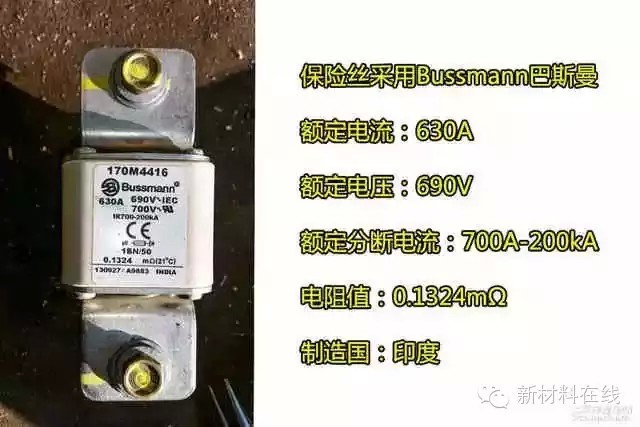 总保险丝位于电池版的前端,并且有外壳保护以防受到撞击。其采用德国Bussmann巴斯曼,额定工作电流为630A,额定电压为690V,分断电流700-200kA,在全球化趋势下该保险丝在印度制造。市场价格在600元左右。