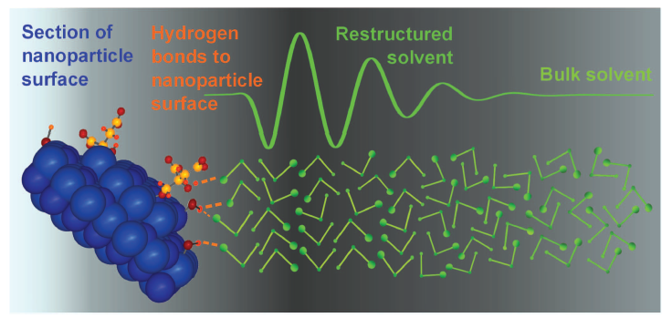 在溶液中,纳米颗粒的物理性质和反应活性不仅与颗粒表面的末端基团有关,还与颗粒表面溶剂序列变化有关,这些变化是由纳米颗粒表面诱导产生的。Zobel等人用x射线散射的方法研究在一系列极性溶剂(乙醇)和非极性溶剂(正己烷)中,各种金属和金属氧化物纳米颗粒表面的溶剂重排现象。他们发现,相比于在溶液中,在纳米颗粒表面的溶剂的有序度提升了。这种趋势与颗粒表面化学结构没太大关系,例如当颗粒表面基团由羟基变为羧酸盐时,并无太大影响。(Mirijam Zobel, et al. Science 2015,347,292-294.)