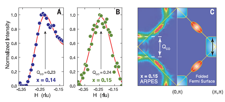 物理学家可以通过化学掺杂空穴或电子的手段,诱导铜氧化物使之成为超导体。目前大部分研究都基于空穴掺杂材料,这些材料中,研究者们发现在超导态附近共存很多不同的相态。其中一种相态是电荷密度的调制态[一种电荷密度波(CDW)],这种相态在空穴掺杂类材料中很常见。最近,Da Silva Neto等证明了在电子掺杂材料Nd2–xCexCuO4中也存在类似的相态。随着他们冷冻材料,作者首次发现CDW,并且观察到这一现象的温度要远高于空穴掺杂材料出现CDW的温度。(Eduardo H. da Silva Neto, et al. Science 2015,347,282-285.)
