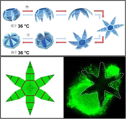 聚 N- 异丙基丙烯酰胺 - 丙烯酸共聚微凝胶 (pNIPAM-AAc) 等水凝胶可通过光度生成大量可自组装的微型结构。当环境温度或 pH 值发生变化时,这种交联聚合物凝胶就会产生明显的可逆膨胀响应,从而发生机械运动。由于凝胶的网状结构及可产生大应变的特性,因此这种行为较容易发生。但是,凝胶的杨氏模量太低,这导致其手术切除动作及抓取、放置等动作中的夹持能力有限。经实验观察和模拟研究后,我们设计、制备并表征了一种微型机械手。这种机械手经过光度,可自折叠,由可膨胀的光交联型 pNIPAM-AAc 软凝胶和不可膨胀的、坚硬的链段聚合物(聚丙烯富马酸, PPF )结合而成。实验表明,将氧化铁纳米粒子嵌入多孔的凝胶层后,还可以通过磁场来远程控制这个微型机械手。通过有限元模拟,我们研究了凝胶和链状聚合物层的厚度及杨氏模量对微型机械手自折叠特性的影响。最后,我们还举例说明了这种微型机械手在软机器人和外科手术中的操作和功能。