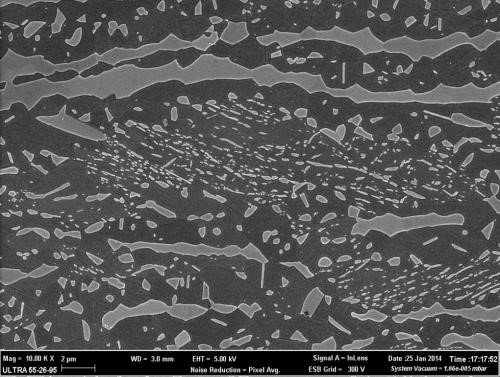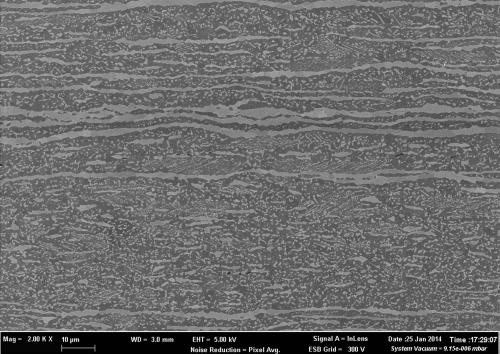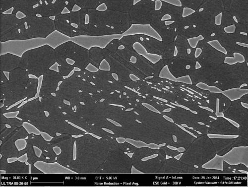 高强度钢退火显微结构。退火过程在钢基体中的精细的FeAl-B2型结晶物。该样品在900摄氏度退火15分钟。