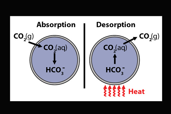 (图示为被包裹的液态二氧化碳收集过程,二氧化碳气体通过高渗透性硅胶外壳扩散进入胶囊,然后被胶囊内的液态碳酸盐吸附剂吸收。随后,聚合物微胶囊被加热,并将二氧化碳释放到隔离系统中。图片来源:Paul Karoff, SEAS Communications)