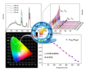温度是一个基本的热力学参数,在现代的科学研究和技术发展中对其进行精确的测定是至关重要的。在测定温度的多种方法中,基于发光的检测方法因其无 创、准确、快速响应、高空间分辨的特点,甚至能适应于强电、磁场及快速运动的物体而受到了广泛的关注。现有的荧光温度计,例如:有机染料、聚合物、半导体 纳米晶、掺杂稀土的无机/有机杂化材料等传感器通常是利用它们随温度增加使发光强度降低的性质而实现温度传感。然而,大多数的荧光温度计通常依赖于一个发 射峰,因此在检测浓度、激发或检测效率改变,或灵敏性差的情况下,容易导致测量结果不准确。