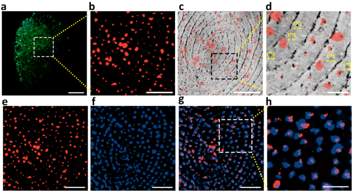 图3 (a)用手指在“超级碳纳米点”复合纸上按压留下的指纹汗孔荧光照片(标尺=5毫米)。(b)为了得到后续更好的叠加图片,使用Photoshop处理后的(a)图中标示区域放大的荧光照片(标尺=2毫米)。(c)对比度增强荧光亮点叠加在数码指纹图像上的照片(标尺=2毫米)。(d)图(c)中标示区域的放大图(标尺=0.5毫米)。(e,f)取自同一施主的两张独立的指纹汗孔荧光图像。为了对比,使用Photoshop处理成红色(e)和蓝色(f)(标尺=2毫米)。(g)图(e)和(f)叠加图(标尺=2毫米)。(h)图(g)标示区域的放大图。