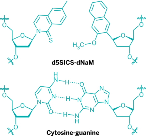 遗传字母表具有三个碱基对,而不是通常的六碱基的mRNA,将可能制成更加多样化的蛋白。 A =腺嘌呤,C=胞嘧啶,G=鸟嘌呤,T =胸腺嘧啶,X = DNAM,Y = d5SICS。