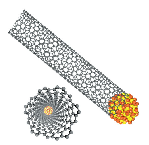 研究人员使用钨- 钴合金纳米晶体(黄色和橙色),生长出高度均匀的碳纳米管(灰色)。如上图侧面和顶视图图解。